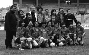 28日,女足老帅马元安携爱将孙雯、刘爱玲等铿锵玫瑰亮相常州体育场。10年过去了,当年的姑娘们都有了很大的改变,当她们重新按照1999年女足世界杯集体照的位置站着拍照时,现场球迷感慨不已。刚刚在上海完婚的老队长孙雯再度作为队长出战,她开心地与每一位“老战友”拥抱。由于“原配门将”高红身在国外,毕福剑客串替老女足守门。
