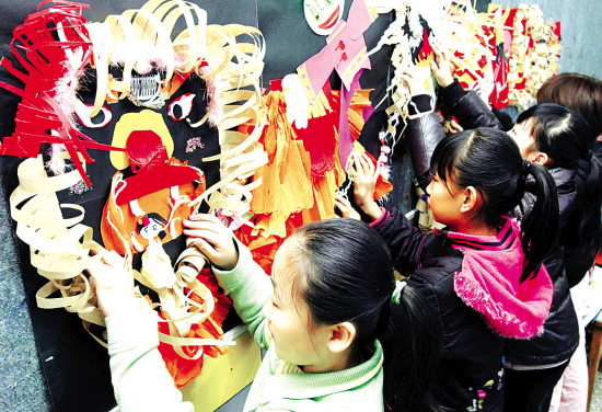 11月29日,在山东淄博少儿美术中心教室内,孩子们用卡纸制作舞狮手工作品。 据悉,孩子们巧手制作的虎头鞋、龙灯、花灯、舞狮等手工作品,将参加明年1月在广东举行的《当代城市儿童美术教育与本土文化的传承》作品展览。 新华社发
