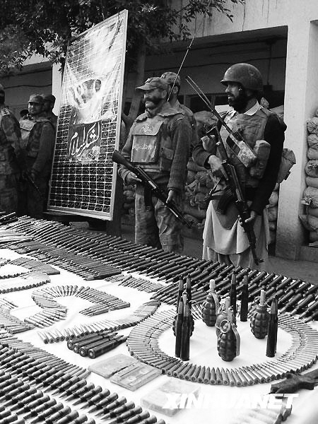 11月30日,在巴基斯坦西北部开伯尔部落地区,巴安全人员向媒体展示缴获的武器弹药。巴基斯坦军方日前在开伯尔及附近部落地区抓获多名塔利班武装分子并缴获大量武器弹药。新华社发