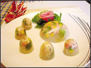 特点:此菜外形如馒头,色彩艳丽(有黄、红、绿等色),晶莹光亮,置于菜肴之中,别具一格。