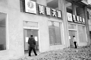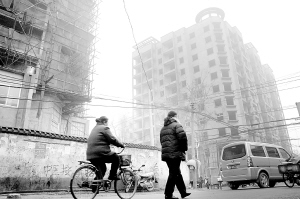 市区文明路与育新街交叉口处,矗立着两栋主体已基本竣工的小高层商住综合楼,早已停工的工地没有昔日工人忙碌的身影和机器轰鸣的声音,寒风中楼体上的防护网来回摆动,让人感到愈发荒凉。