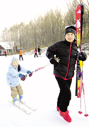 相比于滑冰,滑雪看起来会柔和一些,首先场地是软的,而且白茫茫、毛茸茸的惹人喜爱,另外装备也没那么多棱角,至少鞋子上没有装刀子。把雪板放到地上,双脚踩到雪板上,使劲一蹬,只听“啪”的一声,鞋子就扣住了,同时,人也就给固定住了,一下子就不会动了。不过不要急,先适应一下,然后鼓起勇气,同样双脚摆成外八字型,略微地弯着腰,保持好重心,双脚慢慢后蹬,再使劲向后支雪杖,刹那间你就滑了起来,也许你还没做好心理准备呢,滑雪就被你学会了!如果你能勇敢地从山顶往下坡滑,就会感觉到空前的刺激。身体轻盈一跃,像燕子般腾空而起,耳边风声呼啸,脚下雪花四溅,飞的感觉就是如此!