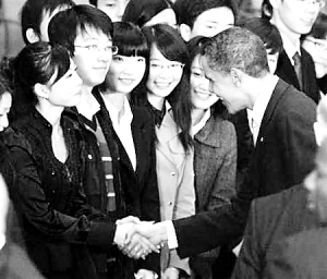 本报综合消息 “奥巴马身后的黑衣美女”王紫菲(图左一,被网友称为“奥女郎”),目前已成为“2009年度网络红人”。这名上海交大在读研究生一夜蹿红后,面对各方质疑开通博客,以《奥巴马总统为我带来什么?》澄清自己“没想进娱乐圈”。而记者多方调查,获知“奥女郎”蹿红其实是一场精心策划的炒作。