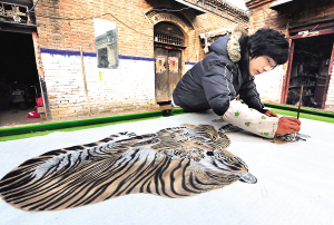 12月9日,一位年轻的农民画家在自家的院子里绘制巨幅虎画作品。河南省民权县王公庄村被誉为“中国画虎第一村”,全村700余人从事绘画产业,产值达2500万元。由于明年是农历虎年,市场上以老虎为主题的年画作品需求量明显增大。目前,全村正组织人力赶制各种虎画。 新华社记者 王颂 摄