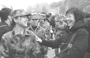 12月10日,一位母亲叮嘱即将登车奔赴军营的女儿好好当兵。