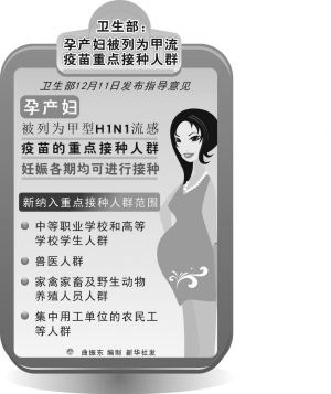 据新华社电 卫生部新闻发言人邓海华11日表示,卫生部决定将孕产妇列为甲型H1N1流感疫苗的重点接种人群,妊娠各期均可进行接种。
