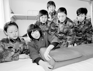 12月15日,班长在教新兵叠被子的技巧。