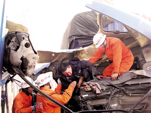 本报讯 12月17日, 两辆大货车在西漯公路白十超限站附近相撞,一名司机被变形的车头卡住。西华县消防官兵经过近一个小时紧张施救,成功救出受伤司机(如右图)。