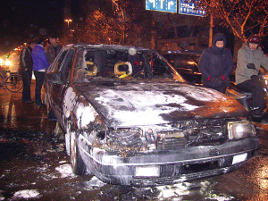本报讯12月17日18时许,在周口人民商场门前,一辆桑塔纳轿车当街自燃。“车一着火,司机就迅速跳出车外,看来只受到一些惊吓。”目击者称。见车内火苗蹿出一丈多高,几名过路司机纷纷拿出灭火器帮忙救火。由于消防官兵及时赶到,火势得到控制。据悉,该车可能是因电路短路引发自燃。