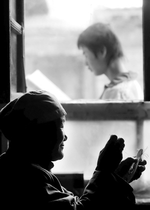 12月16日午饭过后,会宁二中初三学生张旭良在租住房的窗外读书,他63岁的奶奶张瑞华(前)在窗下做针线活儿。