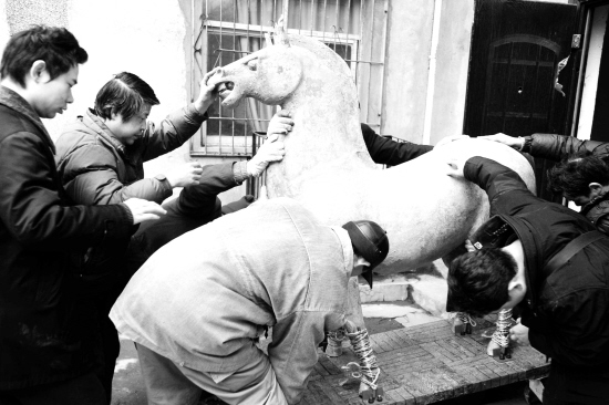 青铜马修复完成 12月23日,工作人员将青铜马运出修复室。 我国迄今为止发现的最大青铜马日前在襄樊市博物馆修复完成,即将进入博物馆展出供市民参观。该青铜马于2008年11月在襄樊市一建设工地被发掘,出土时仅剩马的前半部分,后半部分为青铜碎片。修复后的青铜马身高1.63米,身长1.62米,重约2吨。 新华社发 安富斌 摄