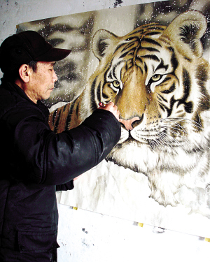 喜爱老虎的崔万林老人希望用画笔展现人与动物和谐相处的生动画面