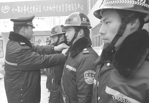 昨天上午,城区治安巡防大队七一中队巡防队员从大队长手中接过统一配发的衣物。据了解,根据四季不同,这批衣物包括防寒服、冬常服、春秋常服和夏常服,以及防暴头盔、巡防帽、警棍等各120套。巡防服臂章上有“巡防”标识,标号以巡防汉语拼音缩写开头,根据辖区及人员不同进行编号。