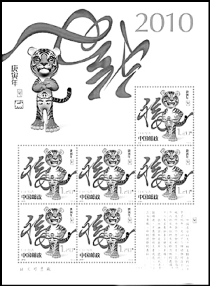 2010年是农历庚寅年,生肖虎年。中国邮政将于明年1月5日发行《庚寅年》特种邮票,一套1枚面值120分,同时发行小本票。