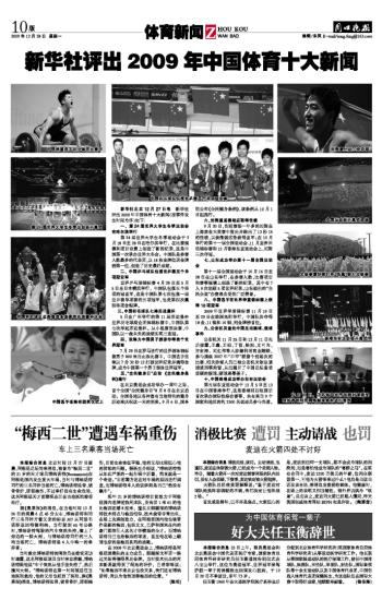 新华社北京12月27日电 新华社评出2009年中国体育十大新闻(按事件发生时间为序)如下:
