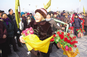 昨天,在淮阳县羲皇文化广场上,一位70多岁的老人在表演担经挑舞蹈。老人与同伴一起边舞边唱,载歌载舞喜迎新年的到来,用歌声和舞步表达新年祝福。 晚报记者 杜 欣 摄