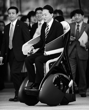 去年12月30日,日本首相鸠山由纪夫抵达日本某公司试驾该公司生产的“i-Real”单人用交通工具。“i-Real”由轻质的碳纤维和塑胶制成,控制方式由传统汽车的方向盘操作改为两侧手臂休息处的控制面板,最高时速可达18.6英里/时。新华社发