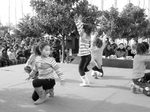 为庆祝2010年元旦,商水县位集镇为农民工子女送来节日“文化大餐”。图为留守儿童正在表演。苏建广 摄