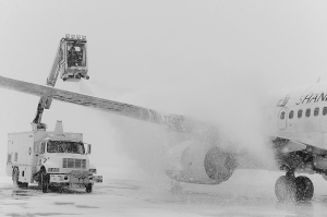 1月3日,首都机场工作人员在用除冰车对飞机进行除冰作业。