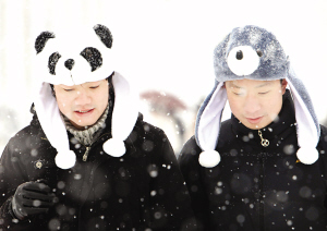 当日,北京普降中到大雪,人们为了御寒,戴上了各种卡通造型的帽子,扮靓了京城的大雪天。