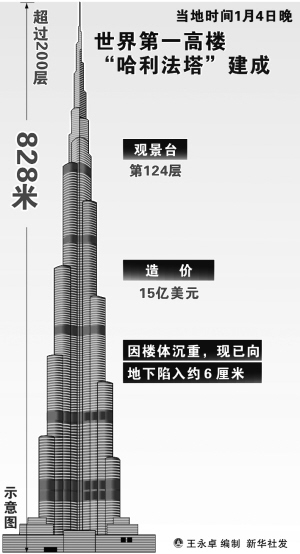 阿拉伯联合酋长国迪拜4日晚举行迪拜塔落成典礼,把这座世界第一高楼更名为“哈利法塔”。神秘面纱揭开,最终高度揭晓:828米。然而,直到启用前最后一刻,塔内多数楼层仍未竣工,加上大多数投机性业主均不会入住,未来一段时间内,迪拜塔可能成为一幢呆立沙漠中央的“幽灵塔”。