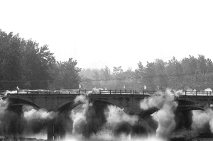 据介绍,老桥采用的是控制爆破与打捞相结合的方法进行拆除的。从2008年8月27日开始,施工人员在桥身桥栏上密密麻麻地打了2600多个爆破孔,填埋了60公斤炸药。