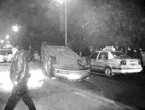 3日凌晨,在四川乐山翰园街路口,有网友拍到一辆豪华车竟被众的哥当街抬了个底朝天。这是怎么回事儿?原来,当天该豪华车的车主因不满后方的士司机按喇叭超车,而“牛气冲冲”地将超车的的士堵在路边,并下车殴打的士司机。不料,几分钟后,20多名驾驶出租车的司机赶到现场,竟当街将这辆豪华车掀了个底朝天,让该车的车主和豪华车再也“牛”不起来。 成商 摄