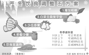 寒冷季节饮食应吃饱不过量,宜多选用谷薯类及粗杂粮、动物性食品、奶类、豆类及新鲜蔬菜和水果。