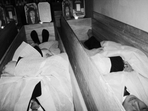 按照规定,在进入棺材前,人们必须经历几个小时的自我反省,写下遗书和墓志铭,并参加自己的葬礼,试试棺材的大小。接着,在一个烛光摇曳的礼堂中,体验者脸朝上躺进棺材中,胳膊交叉在胸前,闭上眼睛。每位体验者都需要忍受孤寂、悔恨并存的痛苦煎熬,不能发出一点儿声响。郑俊说:“只有亲身体验后,你才会感觉自己重生了。一旦从棺材中出来,就要准备好开始新的生活,而这次要活得更有意义。”
