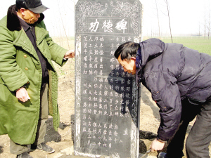 1月6日上午,在项城市孙店镇盐店行政村邝庄村头,村民们自发地为一位老人立了一座功德碑(如图)。碑文称赞老人“感恩于国家对五保老人的特殊照顾,义无反顾,悉数捐款一生积蓄两万多元修路补桥……积德行善,芳名流传”。