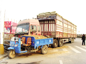 1月6日7时许,在鹿邑县迎宾大道中段,一辆运土的农用三轮车因抢道,致使右侧车身被尾随其后的一辆大货车的车头硬生生地撞上了(如图)。这次事故虽未造成人员伤亡,但两车车身均受损严重。