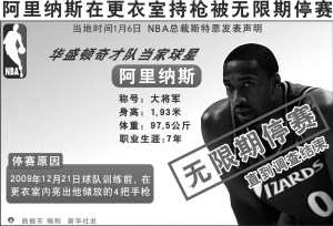 据新华社电 手握上亿美元合同的奇才队当家球星阿里纳斯当地时间6日被NBA无限期停赛。