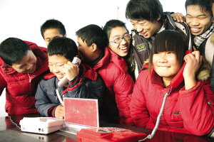 1月7日,河北省广平县广平镇中学留守学生张金涛(前左)、马双双(前右)通过“亲情热线”向远在外地打工的父母汇报学习情况,引来同学们围观。