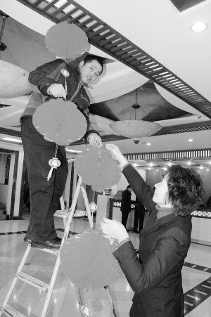 昨天,市区平原宾馆的工作人员将红灯笼、窗花等红红火火的喜庆饰品挂在宾馆大厅或摆在最显眼的位置,营造出浓郁的春节气氛,让进入宾馆的宾客感受到春节的气息。晚报记者 朱海龙 摄