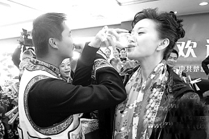 本报综合消息 日前,中国文联、中国红十字会举办的“送欢乐下基层”赴云南慰问演出活动在楚雄举行。演出结束后在欢迎午宴上,宋祖英与彝族祝酒的汉子喝起了交杯酒。 (刘伟)
