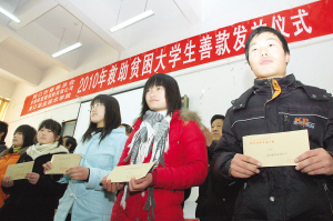 周口职业技术学院动物科学系08级畜牧兽医二班的小胡是南阳市新野县人,其弟弟正上高中,父母在家务农,一家生活靠6亩薄田维持。懂事的小胡不忍心看到父母受累,曾萌发了退学的想法,但小胡爸爸坚决不同意。小胡说,接到这1000元的捐助,她感到沉甸甸的,将铭记在心。她表示将珍惜来之不易的学习机会,就业后,将以自己的实际行动回报社会,将爱心一步步延伸下去。