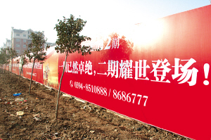 昨天上午,记者再次来到“阳光澜岸”二期工地,远远看到塔吊仍在运行,工地一片繁忙景象,丝毫没有停工迹象。在工地的围墙上,张贴着醒目的“阳光澜岸”二期售房宣传广告(如图)。