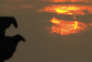 16时50分许,在食甚的那一刻,太阳突然跃出厚厚的云层,像一枚巨大的“金戒指”(如下图)悬挂在空中,尽管有些许浓云遮蔽,尽管仅仅出现几十秒时间就倏然消逝,但是在那一丝珍贵的阳光下,记者仍为能够亲眼目睹这一千年难遇的“惊鸿一现”的天文奇观而兴奋不已。