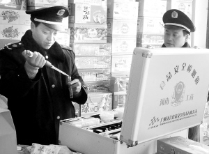 昨天上午,扶沟县工商局执法人员在辖区内一个食品店检测食品质量。春节即将来临,扶沟县工商局为确保节日市场的繁荣稳定,维护节日市场秩序和市场消费安全,重点整治食品等重要商品质量,严厉打击各种不正当竞争和欺诈行为。晚报记者 金月全 摄 线索提供 卢付昌