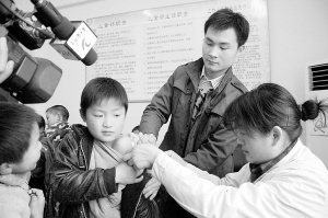 医务人员正在给孤儿接种甲流疫苗。昨日,市卫生防疫部门医务人员来到市福利院,为30多位孤儿接种了甲流疫苗。晚报记者 朱海龙 摄