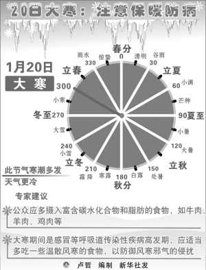天文专家提醒说,大寒时节天气寒冷,人们要注意保暖,有心脑血管病史的人在此时节中尤其要注意保暖,早晚要少出门,避免感冒。早上应尽可能晚起,中午或下午可到户外活动一个小时左右,外出时一定要加穿外套,最好戴上口罩、帽子和围巾。