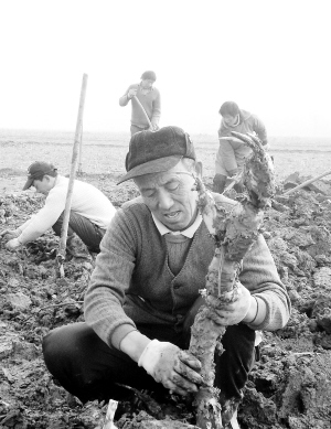 夏采莲子冬挖藕,临近春节,正是莲藕上市时。1月18日下午,在扶沟县城郊乡五里店村一个干枯的池塘里,63岁的村民张明春冒着严寒,把又粗又长的莲藕从淤泥里一根根挖出来。