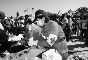 一名海地妇女的手部伤口已经严重化脓,医疗小分队队员们立刻为她清理伤口。一名叫雅克的7岁男孩脚部受了伤,医生迅速将其伤口的脓去掉,再仔细进行消毒包扎……