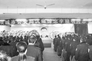 本报讯 1月19日,在项城市公安局6楼会议室,维和英雄李晓明的遗像旁,摆满了花圈和鲜花,遗像中的他依然那么帅气、可亲。这里是李晓明生前曾工作过的地方。当天下午,该局局领导和全体干警怀着万分悲痛的心情,沉痛悼念战友李晓明。