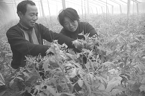 1月21日,淮阳县郑集乡七里河行政村农民徐克银夫妇在冬暖式反季节蔬菜塑料大棚管理西红柿。