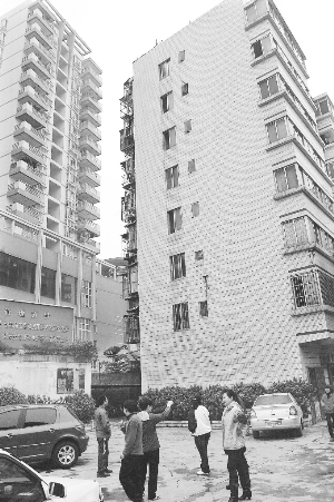 本报综合消息 20日,广西南宁市北大南路4号一小区内,业主们对一栋已发生下沉并倾斜的楼房(上图)担忧不已。业主们称,自2003年隔壁的一房地产项目开工建设以来,楼房就开始下沉并倾斜,楼内裂痕遍布,情况日趋严重。如今,200多居民仍心惊胆战地住在这栋楼房里。(中新)