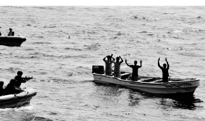 当地时间22日12时许,中国海军护航编队接到刚刚解护的“乐从”号商船求救信号,称其遭到一艘白色快艇追击。编队指挥所立即派遣“巢湖”舰和“马鞍山”舰快速前出,同时派出舰载直升机赶往事发海域。12时28分,“巢湖”舰舰载直升机锁定转向追击“鸿达”号商船的白色快艇,并发射3枚信号弹,白色快艇被迫停船接受检查。随后“马鞍山”舰派出2艘小艇靠近(上图),特战队员立即对白色快艇实施登临检查,发现快艇上有4名船员,装有油桶、锚钩和手机GPS定位仪等物品。在确认对商船没有威胁后,特战队员对疑似海盗快艇进行了警示驱离。新华社发