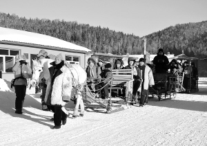 1月24日,游客在牡丹江大海林双峰林场内乘坐马拉爬犁观光游览。2009年12月以来,素有“中国雪乡”之称的黑龙江省牡丹江市大海林双峰林场开始推行景区游客低碳游览计划,所有游客乘坐专用观光车辆进入景区,在景区内或徒步或乘坐马拉爬犁等游览,有效控制了景区内的机动车流量。新华社发