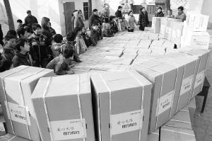 当日上午10时许,满载着学习用品的专车驶进了李灵希望小学。学生们欢呼雀跃地跑来搬运学习用品,校园里充满了欢快的笑声。得力集团副总经理优君伟介绍,这些学习用品都是公司员工几天前加班加点赶制出来的,目的是让学生们在新春前收到这份“年货”。记者看到,几十个礼包箱整齐地摆满了校园(如图),每个箱子里都装有书包、铅笔、笔记本、削笔器和文具盒等学习用品,其中还有一些教学工具。据了解,这批“年货”共计500套,总价值达15万余元。
