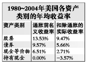 统计数据显示,1980年~2004年,美国投资股票的实际年收益率高达9.47%(扣除通胀因素)。很显然,从一个相对较长的历史周期看,战胜通货膨胀的较好金融工具主要是股票或者股票基金(见上表)。